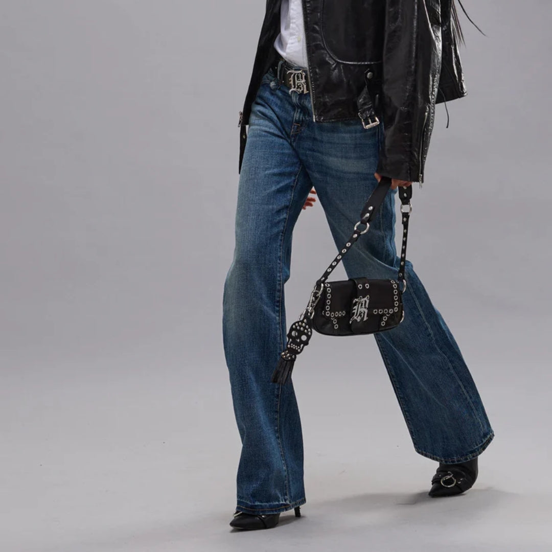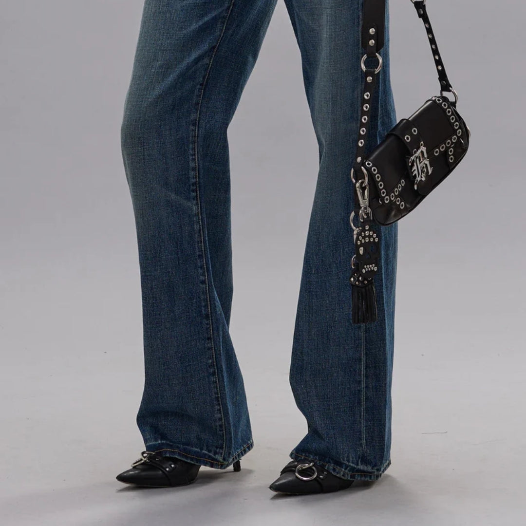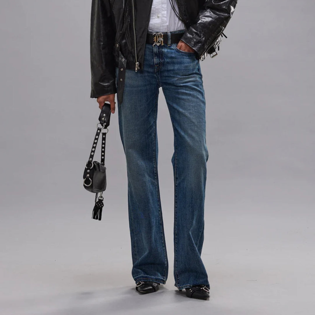 Low rise relaxed straight jean built with 13 oz. rigid blue denim with a medium wash and moderate wear pattern.