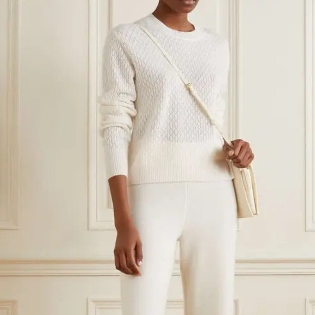 A new style from our perennial favorite cashmere brand, Le Kasha. The Lourdes pointelle knit organic cashmere sweater - knitted for a relaxed fit. Beautiful pointelle detail throughout.