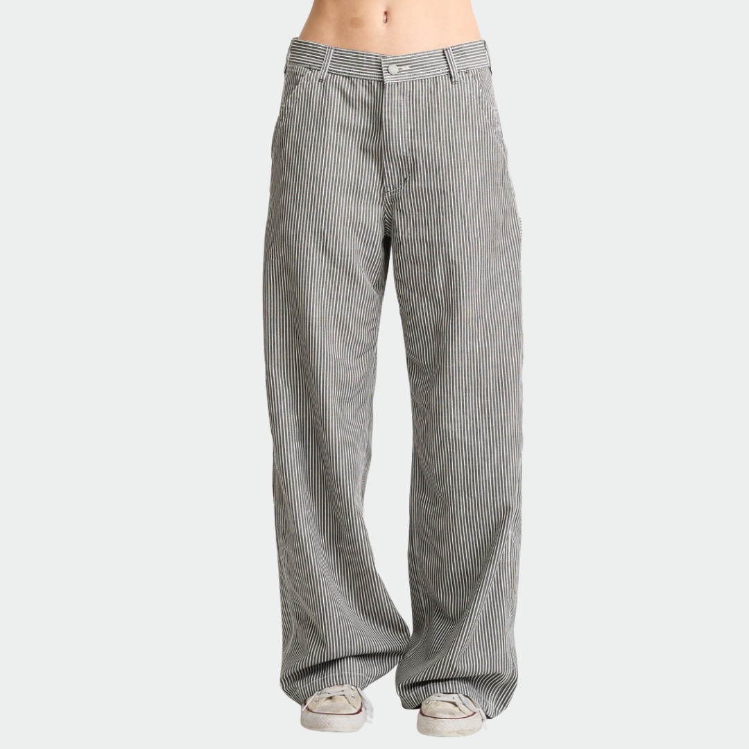 The Teri Wide Leg Carpenter Pant is a fresh take on utility-inspired denim. With a mid-rise fit and spacious wide leg, it offers effortless comfort and a laid-back silhouette. This version is dark gray with a white railroad stripe pattern throughout.