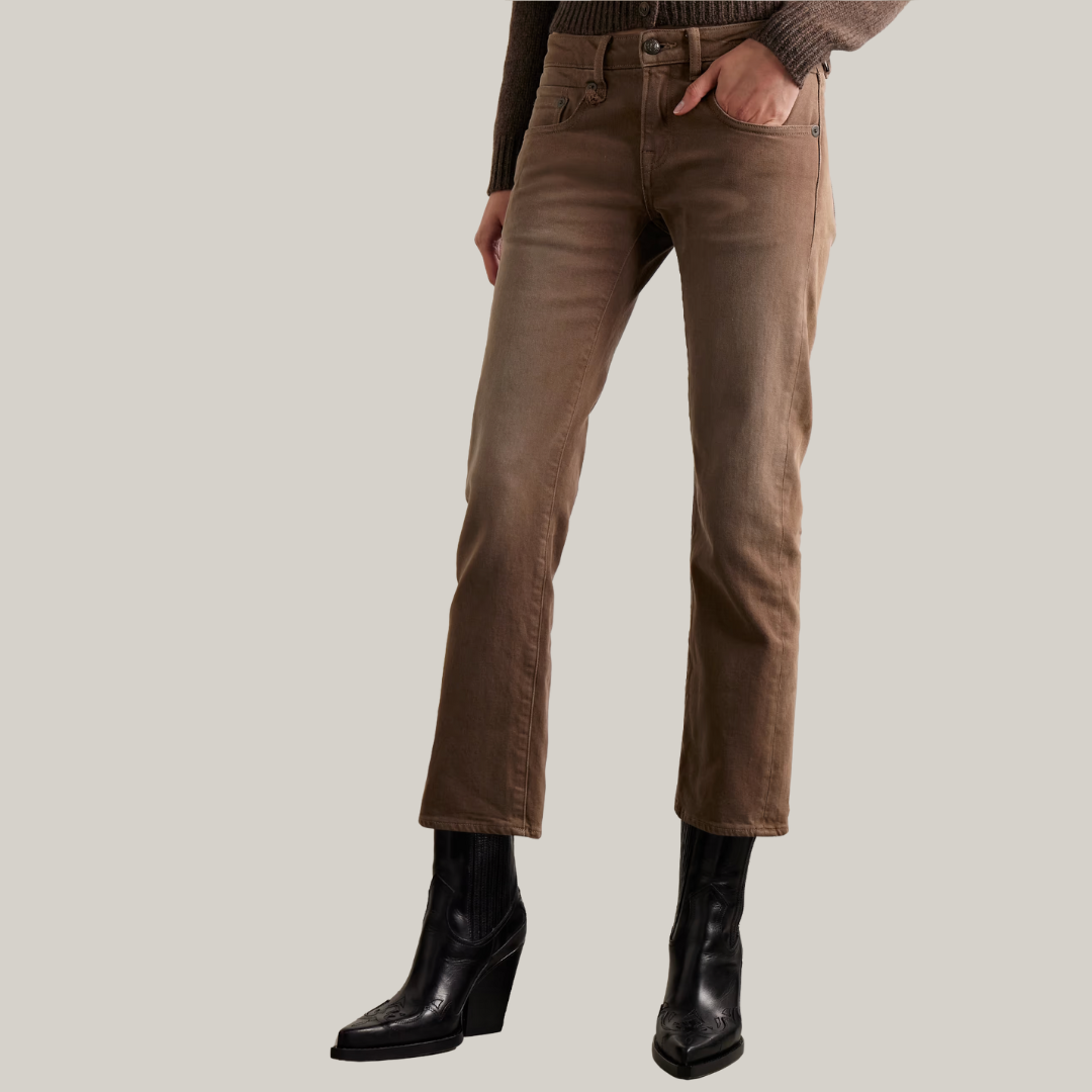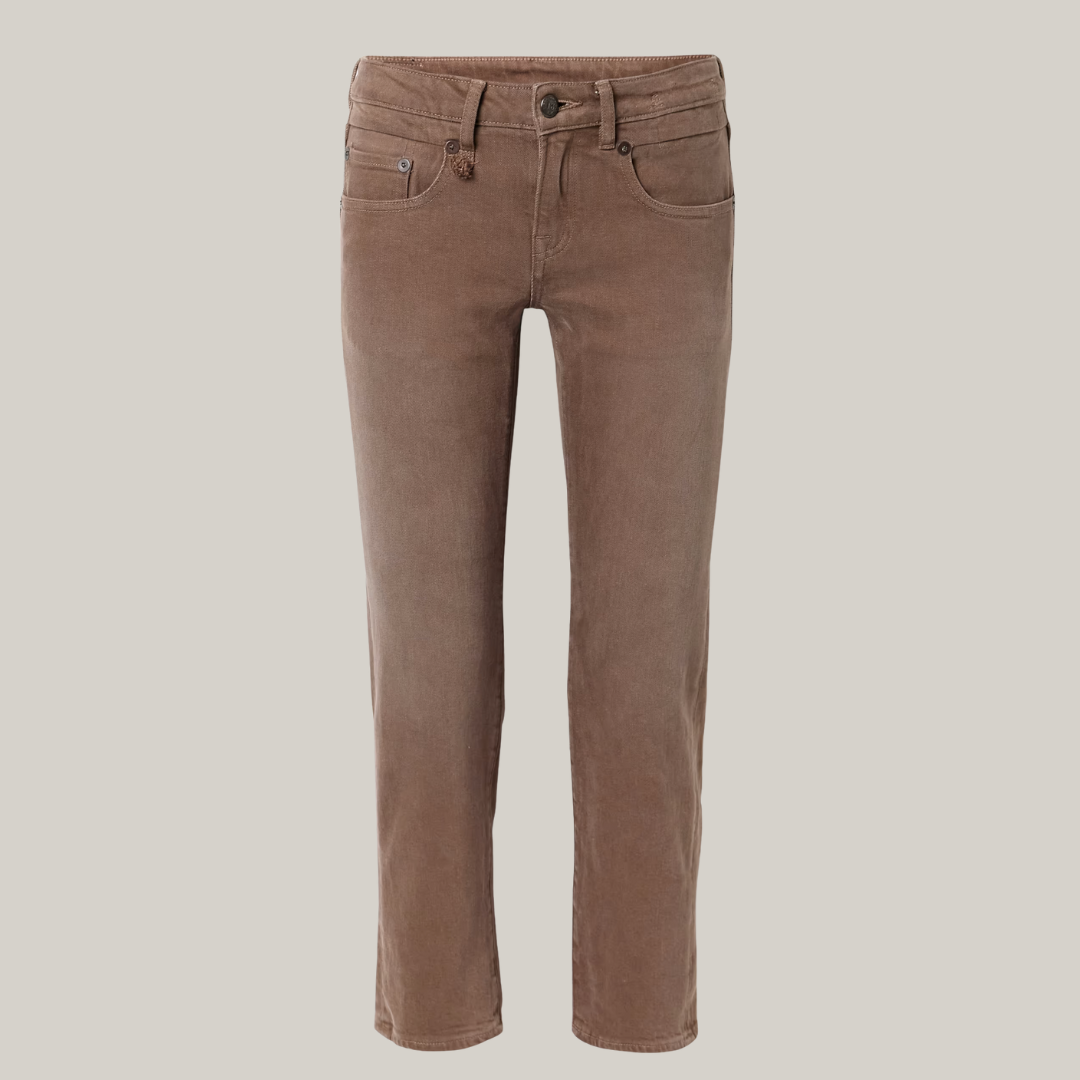 R13's low-rise jeans are reminiscent of styles from the early aughts. They're made from brown denim and have straight legs cropped just above the ankle. We love this "clean umber" wash, a lived-in brown.